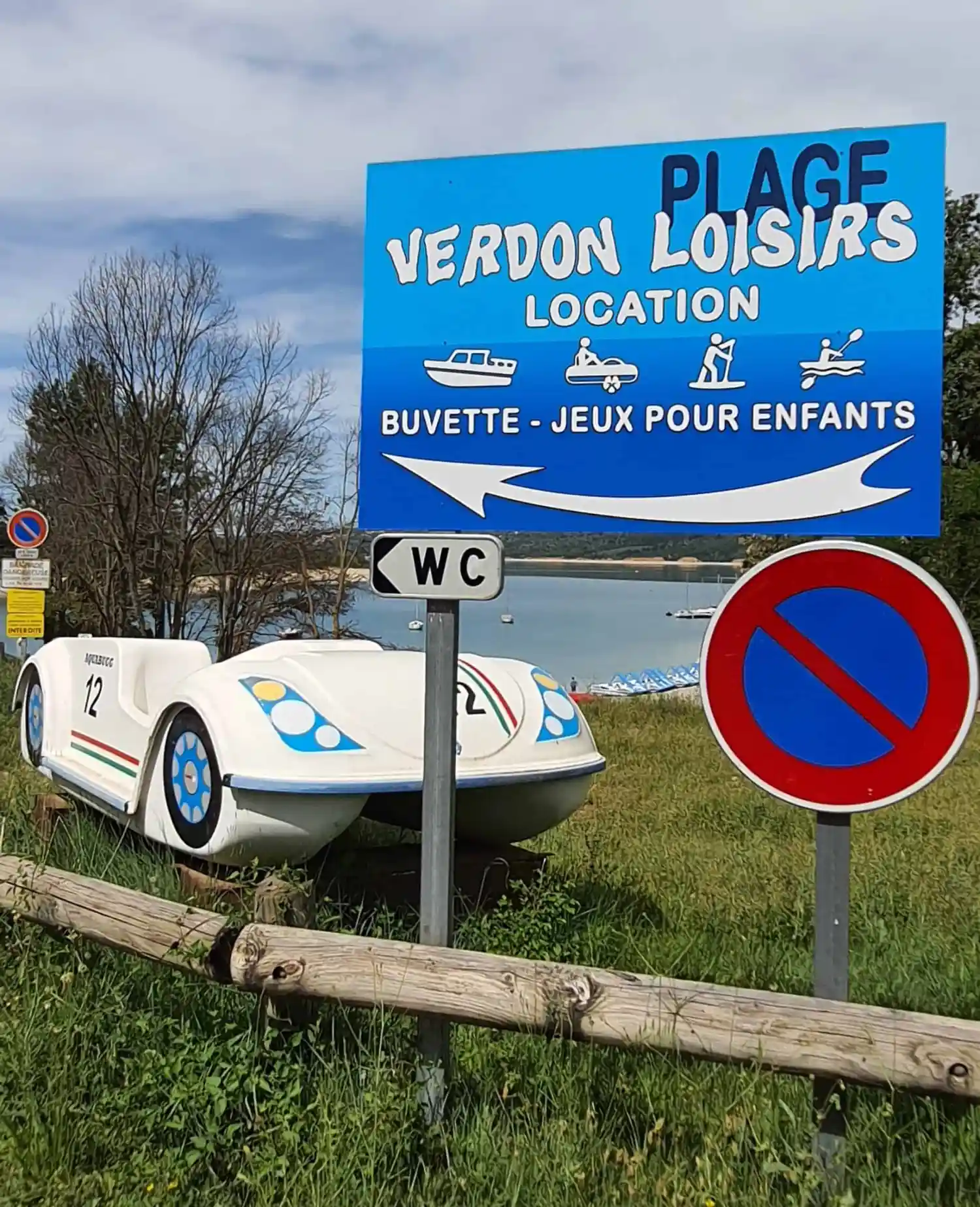 En arrivant aux Salles-sur-Verdon, restez toujours sur la même route, après 500 mètres vous entamerez la descente qui mène au lac. Vous trouverez le panneau VERDON LOISIRS au bout de cette route et vous pourrez garer votre véhicule sur le parking situé à gauche de ce panneau.